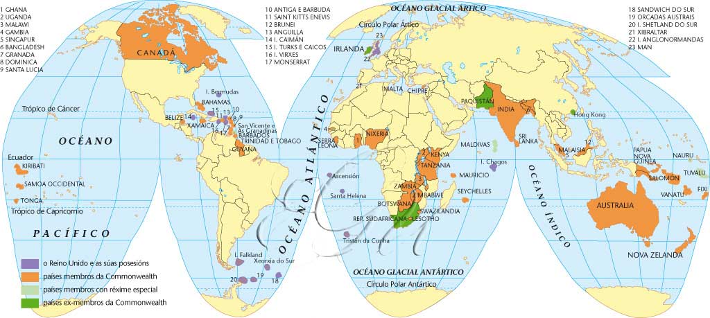 Asociación de nacións constituída polo Reino Unido (coas súas colonias e dependencias) e por unha serie de estados soberanos nacidos a partir do imperio colonial británico. Réxense por un complexo sistema de reunións e consultas, entre as que destacan as reunións de ministros de finanzas e as conferencias dos xefes de goberno. O órgano permanente é a Secretaría Xeral, creada en 1965. As grandes diferencias económicas, culturais e políticas que separan e, a miúdo, enfrontan os membros, non esgotan en gran parte a súa eficacia. Só no terreo arancelario (tarifas preferenciais) se alcanzaron acordos importantes. Aínda que ata finais de 1926 non se produciu a primeira formulación oficial, cómpre situar as orixes na segunda metade do s XIX e nas primeiras décadas do s XX, período durante o que as colonias británicas con maioría de poboación branca (Canadá, Australia, etc) alcanzaron o estatuto de dominio e, xuntas, unha autonomía que se parecía moito á independencia. Os tratados de paz asinados ao rematar a Primeira Guerra Mundial polos dominios en calidade de estados independentes, puxeron de relevo a necesidade de adecuar as estruturas legais á realidade. Por iso, a conferencia imperial de 1926 proclamou: “Gran Bretaña e os dominios (Canadá, Australia, Nova Zelanda, Sudáfrica, Estado Libre de Irlanda e Terranova) constituíron comunidades autónomas dentro do Imperio Británico, con igualdade de dereitos e soberanía, aínda que unidas por unha mesma fidelidade á coroa e liberación asociadas como membros da British Commonwealth of Nations”. O movemento descolonizador que seguiu á Segunda Guerra Mundial ampliou notablemente o número de estados membros da Commonwealth. En 1976 foille concedido o status de observador á Organización das Nacións Unidas.