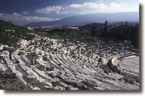 Situado aos pés da Acrópole de Atenas, formou parte dun santuario dedicado a Dióniso Eleutéreo, do que se conservan restos de dous templos. A primitiva construción tiña as bancadas de madeira pero reconstruíuse en pedra no s IV a C e reformouse en tempos de Nerón. A cávea tiña capacidade entre 14.000 e 17.000 espectadores. Consérvanse as bases das estatuas que decoraban a cávea e o inicio da escena.