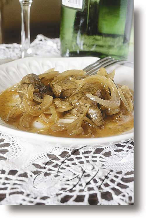 Ex: O encebolado de peixe estaba un pouco queimado. Gústame o fígado encebolado.