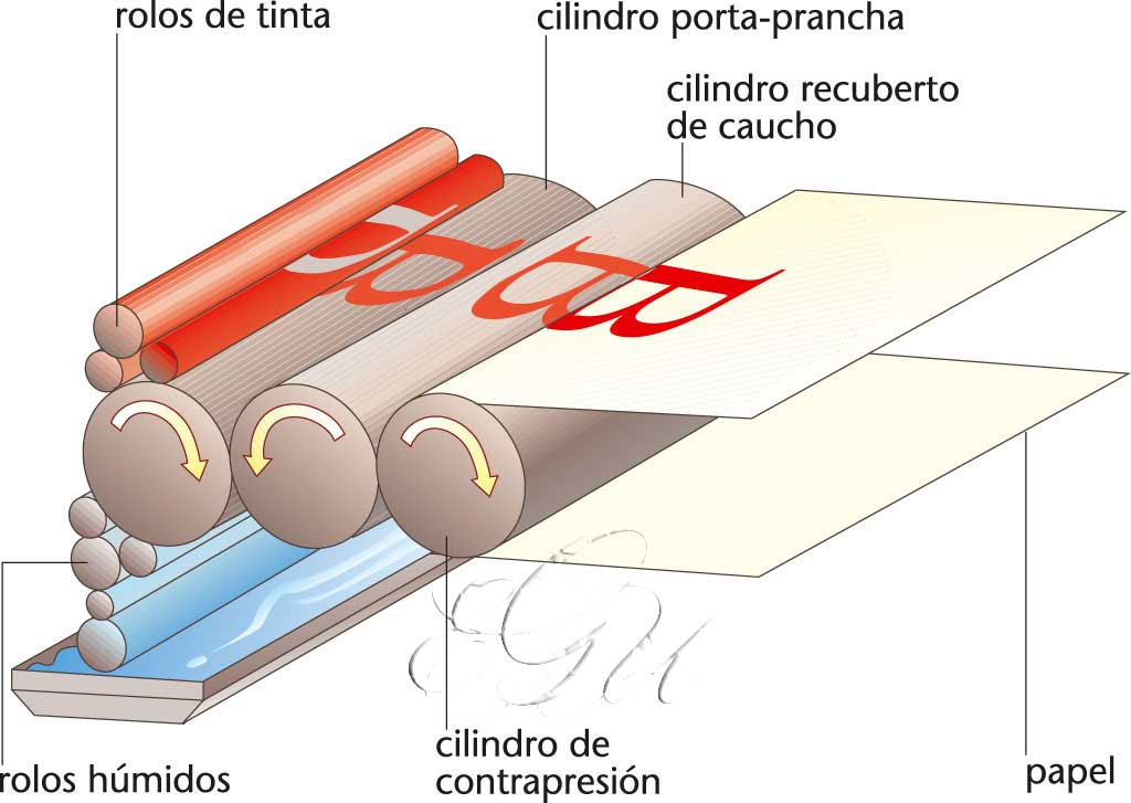 Sistema de impresión que se basea na repulsión que existe entre a auga e as materias graxas, como a litografía, da que provén. Este sistema denomínase de impresión indirecta pois, contrariamente aos outros sistemas tradicionais, a prancha impresora non ten contacto co papel. O offset foi descuberto a comezos do s XX polo impresor estadounidense Ira Rubel e impúxose máis pola rapidez e polos seus prezos competitivos ca pola súa calidade. Ao principio, as pranchas impresoras eran de cinc ou aluminio e estaban sensibilizadas polos materiais impresores. A comezos do s XXI dánselle ao impresor xa sensibilizadas e a punto para a insolación (fotogravado). A importancia que conseguiu o offset dentro do mercado da impresión débese á flexibilidade que ofrece a montaxe das diferentes follas sobre un mesmo molde (lanzamento), ás múltiples facilidades de confección das pranchas de impresión e á posibilidade de imprimir a cor e en gran formato sobre papel relativamente ordinario. As modernas máquinas offset utilizan cada vez máis o mando por ordenador en todos os procesos.