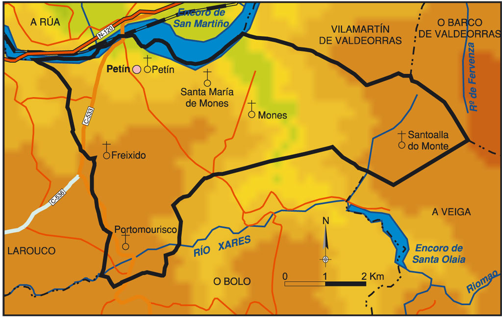 Concello da comarca de Valdeorras, situado na provincia de Ourense no SL da Comunidade Autónoma de Galicia, a 42° 23’ de latitude N e 7° 07’ 30’’ de lonxitude O. Limita ao N coa Rúa e Vilamartín de Valdeorras, ao L co Barco de Valdeorras, ao S co Bolo e A Veiga, e ao O con Larouco (todos eles na comarca de Valdeorras). Abrangue unha superficie de 30,5 km 2 , en que acolle unha poboación de 1.066 h (2007), distribuída nas parroquias de Freixido, Mones, Petín, Portomourisco, Santa María de Mones e Santoalla do Monte. A súa capital está no lugar de Petín, na parroquia do mesmo nome, a 185 km de Santiago de Compostela e a 100 km de Ourense. Está adscrito á diocese de Astorga e ao partido xudicial do Barco de Valdeorras.