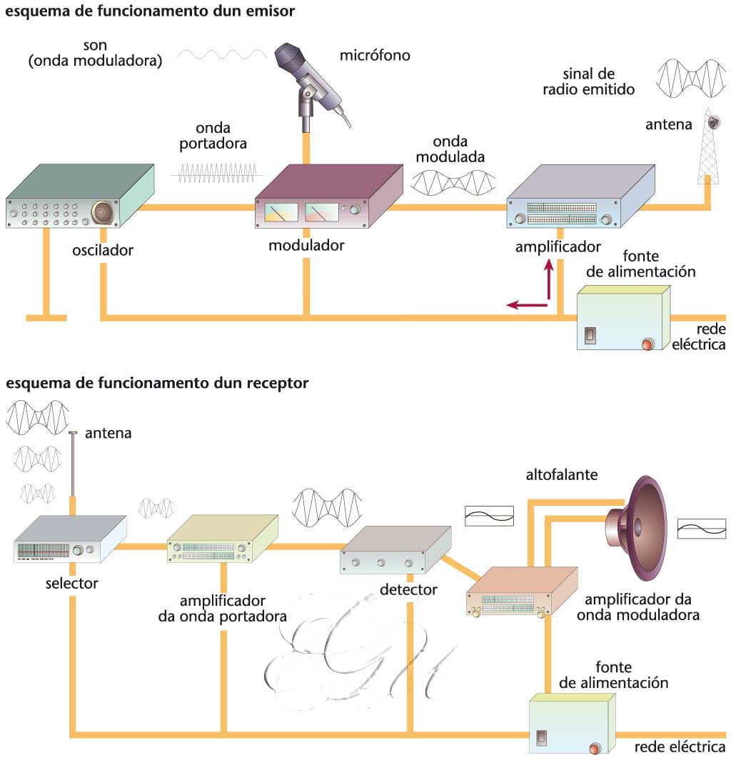 Transmisión a distancia mediante ondas hertzianas do son, especialmente de voz humana e música, en forma de programas. A historia da radiodifusión -radio- é tamén a historia do electromagnetismo. H. C. Ørsted foi o primeiro en comprobar, en 1820, que unha agulla magnetizada é afectada por unha corrente eléctrica. A. M. Ampère, durante os mismos anos que Ørsted e baseándose nos experimentos deste, formulou a lei que leva ou seu nome. M. Faraday en 1831 interpretou as conclusións de Ørsted e Ampère e engadiu que un campo magnético variable induce unha forza electromotriz, e por tanto unha corrente eléctrica, nun condutor, e demostrou a veracidade desta hipótese ao construír o primeiro motor eléctrico. C. F. Gauss e W. Weber colaboraron entre 1831 e 1837 no estudo dos campos magnéticos, pero foi J. C. Maxwell quen deu unha expresión matemática á física dos fenómenos electromagnéticos baseándose nos traballos dos anteriores. As catro ecuacións diferenciais que se coñecen como leis de Maxwell representan o fundamento do electromagnetismo. Entre 1885 e 1889 H. Hertz demostrou a existencia das ondas electromagnéticas que Maxwell predixera dez anos antes. Hertz empregou un circuíto eléctrico capaz de producir oscilacións que contiña unha abertura nun cable eléctrico que producía ondas cun arco ionizado. O receptor era un cable circular cunha abertura similar. Con este aparato Hertz foi capaz de demostrar a transmisión de ondas electromagnéticas a distancia. En 1894 G. Marconi, coñecedor dos experimentos de Hertz, concibiu o uso das ondas “hertzianas” para a transmisión de telegramas. En 1895 conseguiu, empregando un oscilador e antenas direccionais creadas por el, transmitir e recibir sinais electromagnéticos a uns poucos quilómetros de distancia. Marconi descubriu o modo de sintonizar diferentes lonxitudes de onda ao empregar condensadores variables e experimentou o alcance con diferentes lonxitudes de onda. A diferenza do telégrafo, a transmisión de voz mediante ondas electromagnéticas implica o uso dunha frecuencia portadora de alta frecuencia modulada de modo continuo polo sinal sonoro. O oído humano responde a sinais acústicos entre 20 Hz e 20 Khz., pero non sería posible enviar este sinal directamente a unha antena para ser transmitido aínda que fora amplificado para darlle máis potencia. Unha antena para ser efectiva ten que ter unha dimensión da orde da lonxitude de onda. As antenas típicas teñen unha lonxitude igual á metade ou a un cuarto da lonxitude de onda que se quere tranmitir. Un sinal, por exemplo de 20 Khz, requiriría unha antena da orde dos 15 km e mil veces máis longa para os sinais de arredor de 20 Hz. Ademais este sinal interferiría con outros sinais deste tipo, sendo só posible unha única emisora nunha certa área. Por estas e outras razóns é necesario empregar unha portadora de frecuencia suficientemente alta e modulala co sinal sonoro, que foi posible cando en 1906 Lee de Forest inventou o tríodo de baleiro, que nuns poucos anos xa era empregado no uso de transmisores e receptores de radio como amplificador e detector e como oscilador de alta frecuencia. Na década de 1910 eran numerosas as emisións de radio, e en 1921 tivo lugar a primeira transmisión transatlántica de voz, empregando onda corta. Estas emisións utilizaban modulación de amplitude, o que permitía o uso de receptores moi simples. As emisións en frecuencia modulada comezaron en 1945. A modulación de amplitude (AM), empregada inicialmente, foi substituída despois pola modulación de frecuencia (FM), con frecuencias moito máis elevadas (VHF). Na AM empréganse a onda curta (OC ou SW), que comprende 8 bandas e ocupa desde os 5,95 aos 26,1 MHz; a onda media ou normal (OM ou MW), que comprende dos 525 aos 1.605 kHzK; e a onda longa (OL ou LW), dos 150 aos 285 kHz, xa pouco corrente. Cada emisora pode ocupar un ancho de 9 kHz, o que só permite transmitir unha banda sonora de 0 a 4.500 Hz. A FM utiliza a banda dosaproximadamente 87 aos 105 mHz, e cada emisora pode ocupar un ancho de 300 kHz, co que se poden transmitir ata 15.000 Hz. Caracterízase por unha alta fidelidade e calidade, pero o alcance da emisora é reducido. A maioría de emisoras de FM emiten en estereofonía: a FM estéreo (FMS), que se basea na transmisión da información mediante dúas canles, dereita (D) e esquerda (E); é compatible (compatibilidade) coa FM normal ou monofónica. Para a recepción dos programas de radio empréganse os radiorreceptores. OBS: Tamén se emprega a forma apocopada radio.