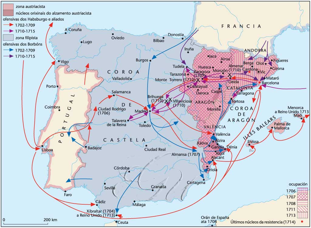 Conflito bélico (1702-1714) que xurdiu pola cuestión sucesoria á coroa hispánica, orixinado pola extinción da dinastía dos Habsburgo. Tras a morte de Carlos II en 1700 sen sucesión, o Emperador Leopoldo I, Inglaterra e Holanda non aceptaron o testamento do monarca defunto, que cedía os reinos hispánicos e as súas dependencias ao neto de Luís XIV, Filipe de Anjou, e apoiaron os dereitos do outro pretendente, o arquiduque Carlos de Austria. Filipe de Anjou chegou a España en 1701 e converteuse no Rei Filipe V. Austria, Inglaterra e Holanda formaron a Alianza da Haia fronte a España e Francia, á que se uniron Portugal e o ducado de Savoia (1703). Mentres, Luís XIV recoñecía os dereitos do seu neto como herdeiro á coroa francesa, aínda que no testamento de Carlos II existía a cláusula de que Filipe de Anjou tería que renunciar a estes dereitos. A guerra comezou en 1702 e, ao ano seguinte, o arquiduque Carlos foi recoñecido como rei de España en Viena. O conflito desenvolveuse, ademais de en territorio español, en Italia, o Rin e os Países Baixos. Carlos de Austria atopou apoio na Coroa de Aragón e, en 1706, as cortes catalás o recoñeceron como rei (Carlos III) e avanzou cara a Madrid, onde entrou sen atopar entusiasmo. Non obstante, Castela alzouse contra un monarca que parecía imposto polos reinos do levante peninsular. O rei arquiduque tivo que abandonar Madrid e as forzas borbónicas chegaron pouco despois. A vitoria borbónica na Batalla de Almansa (25.4.1707) desorganizou o exército carolino e obrigouno a abandonar València e Aragón en mans de Filipe V. Este, pouco despois, ditou os primeiros decretos de Nueva Planta que anulaban as constitucións aragonesas e valencianas. As tropas aliadas, non obstante, recibiron importantes reforzos, e Sardeña, Nápoles e as Illes Balears foron arrebatadas aos Borbóns. En 1710 o arquiduque Carlos, axudado por tropas inglesas e alemás, recuperou Aragón, pero a demora en chegar a Madrid impediu o enlace do exército aliado coas forzas portuguesas. A contraofensiva franco-castelá en La Alcarria (batallas de Brihuega e Villaviciosa) provocou a desfeita das pretensións do arquiduque de instalarse en Madrid e, ao principio de 1711, tivo que se repregar a Catalunya. Ante a alternativa de ver refacerse o imperio de Carlos V se triunfaba o pretendente, Inglaterra e Holanda decidiron non enviar máis tropas. Polo Tratado de Utrecht (1713), o arquiduque Carlos recibiu os antigos dominios españois nos Países Baixos, Milán, Nápoles e Sardeña; Sicilia pasou ao duque de Savoia; e Xibraltar, ocupado en 1704, e Menorca, ocupada en 1708, aos británicos. En 1714 Filipe V entrou en Barcelona. A súa vitoria supuxo a centralización administrativa dos reinos hispánicos. Aos decretos de 1707 uníronse os de 1716 que abolían as constitucións catalás e que implantaron a centralización administrativa castelá en todos os reinos hispanos.