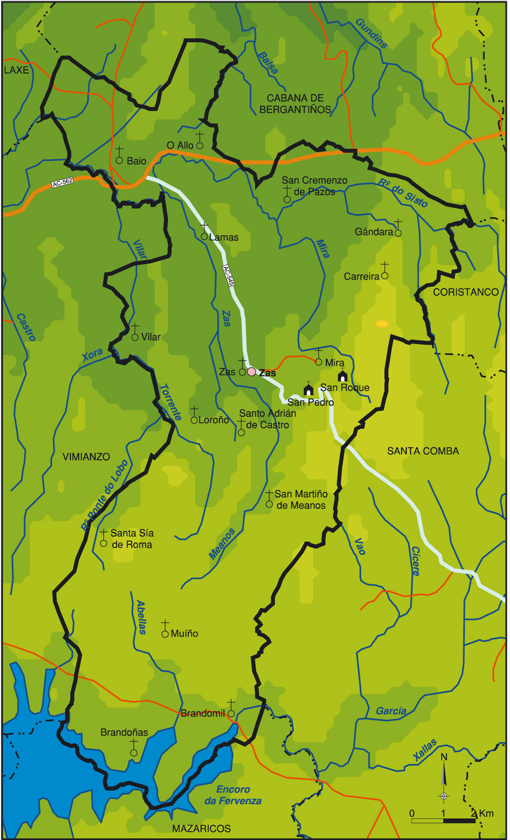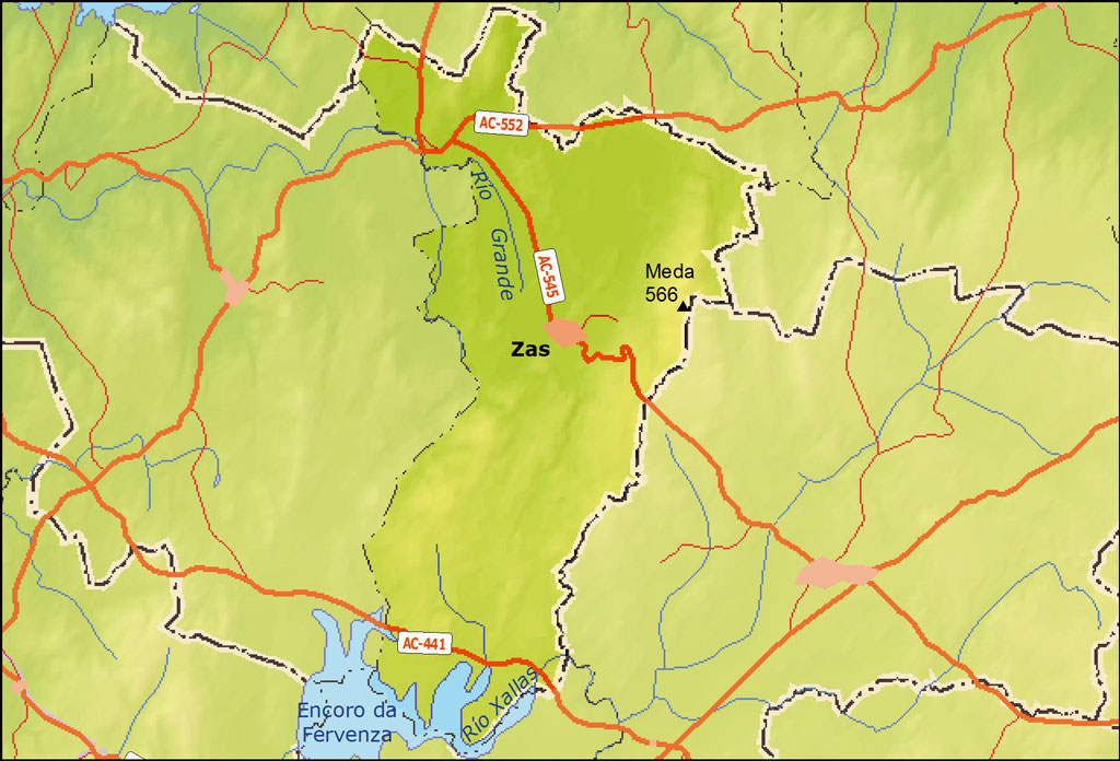 Concello da comarca da Terra de Soneira situado no NO da Comunidade Autónoma de Galicia e da provincia da Coruña. Limita ao N co concello de Cabana de Bergantiños (comarca de Bergantiños), ao S co de Mazaricos (comarca de Xallas), ao L cos de Coristanco (comarca de Bergantiños) e Santa Comba (comarca de Xallas) e ao O cos de Vimianzo (comarca de Terra de Soneira) e Laxe (comarca de Bergantiños). Abrangue unha extensión de 133,2 km 2 cunha poboación de 5.549 h (2007) distribuída nas parroquias do Allo, Baio, Brandomil, Brandoñas, Carreira, Gándara, Lamas, Loroño, Mira, Muíño, San Cremenzo de Pazos, San Martiño de Meanos, Santa Sía de Roma, Santo Adrián de Castro, Vilar e Zas. A capital é a vila de Zas (43° 06’ 07’’ N - 8° 54’ 48’’ O) a 80 km da Coruña e 59 km de Santiago de Compostela. Está adscrito ao partido xudicial de Corcubión e á arquidiocese de Santiago.