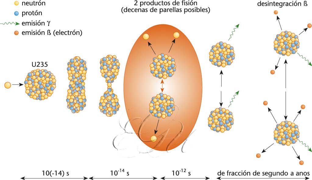 Reacción nuclear exoenerxética consistente na partición dun núcleo atómico noutros dous núcleos de masas comparables. Foi descuberta ao bombardear uranio con neutróns, coa idea de obter, artificialmente, elementos descoñecidos. En 1934 Fermi utiliza os neutróns como proxectís de bombardeo contra núcleos, especialmente de uranio, e termina por descubrir un isótopo do elemento 93 (neptunio). En 1939 Hahn e Strassmann, con experiencias semellantes, identificaron un isótopo do bario (elemento 56) e o seu descendente radioactivo, o lantano (elemento 57), polo que foron considerados como descubridores da fisión. As características esenciais da fisión son unha gran liberación de enerxía (200 MeV), a formación de núcleos radioactivos e a emisión de neutróns. A emisión de novos neutróns en cada fisión provoca novas fisións polo que ten lugar unha reacción en cadea, que pode ser incontrolada (caso dunha bomba nuclear) ou controlada (caso dun reactor nuclear). Dun xeito xeral, a excitación necesaria para provocar a fisión dun núcleo correntemente ten lugar con neutróns, pero tamén pode ter lugar mediante o bombardeo con partículas α, protóns, deuteróns e absorción de raios γ. Os núcleos resultantes, moi radioactivos, denomínanse produtos de fisión. En 1939 Bohr e Wheeler descubriron a fisión espontánea.