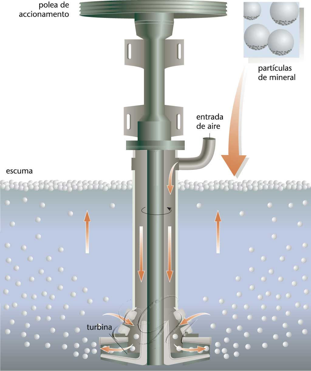 Operación que se fai para separar un ou máis compoñentes dunha mestura de minerais, de compostos químicos, etc, en suspensión acuosa, por medio dunha corrente de aire que se introduce no seo do fluído e que arrastra selectivamente o compoñente que se quere separar. Este comportamento selectivo débese á distinta afinidade superficial dos materiais fronte á auga ou ao aire. Emprégase a flotación para concentrar o mineral extraído das minas, do que elimina unha parte da ganga.