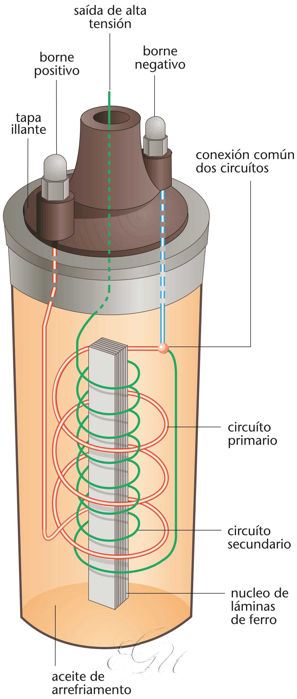 Transformador de tensión provisto dun circuíto magnético aberto e no que o circuíto primario, de moi poucas espirais respecto ao secundario, se alimenta con corrente continua interrompida periodicamente pola acción dun vibrador, ruptor ou dispositivo análogo. Ideada por Ruhmkorff no ano 1851, emprégase nos motores de acendido por chispa.