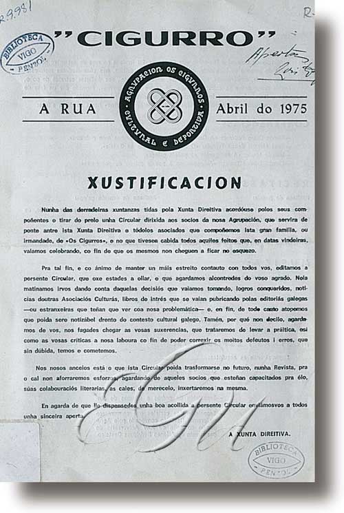 Publicación en galego aparecida en Ourense en 1975 e promovida pola asociación cultural e deportiva Os Cigurros. Acollía as seccións “Feitos”, “Aniversario” e “Noticias”; informaba sobre música, teatro, cine e premios literarios, como o Premio Castelao que gañou o poema “Pranto de irmao a Castelao vivo e morto”, de Xavier R. Barrio; e incluía ilustracións e recensións sobre libros e colaboracións poéticas, como “Poema do alleado” ou “Poema íntimo”, de Manuel María.