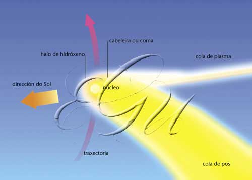 Corpo celeste do Sistema Solar, de pequenas dimensións e forma irregular, que describe xeralmente unha órbita de grande excentricidade, polo que só é visible desde a Terra durante a pequena parte da súa órbita en que se achega ao Sol (perihelio) e desenvolve a cola luminosa característica. A imaxinación popular considerou que as aparicións dos cometas eran sinais enviados polos deuses para anunciar catástrofes futuras. Os gregos intentaron dar unha explicación racional do fenómeno: Aristóteles supuxo que os cometas eran simples meteoros atmosféricos e non admitiu que fosen astros análogos aos planetas. O establecemento da verdadeira natureza dos cometas centrouse en tres feitos: en 1535 descubriuse que a cola dun cometa indica sempre a dirección oposta ao Sol; a primeira determinación correcta da distancia a un cometa realizouna Tycho Brache en 1577; finalmente, a aplicación da mecánica de Newton levou a E. Halley a afirmar en 1705 que os cometas observados en 1531, 1607 e 1682 eran aparicións correlativas dun mesmo obxecto celeste, de tal forma que introduciu a idea da súa periodicidade. A sonda automática ICE (1985) e as cinco sondas enviadas para estudar de cerca o cometa Halley en 1986 permitiron fundamentar o modelo correntemente aceptado sobre a natureza destes corpos. Neste modelo, denominado bóla de neve sucia e proposto por Fred Whipple no 1953, o cometa consiste basicamente nun núcleo sólido de pequenas dimensións (1-100 km de diámetro) constituído por unha masa de xeos (de auga, metano, amoníaco e outros), gases (CO, CO 2 , N 2 e outros) e po meteorítico. Ao achegarse ao Sol, a calor evapora os xeos e libera os gases e o po do núcleo, e como consecuencia fórmanse a cabeleira e as colas. A cabeleira ou coma, é a envoltura luminosa de forma esférica que rodea o núcleo. Está constituída por partículas de po e moléculas expelidas polo núcleo, cun radio de 10 5 -10 6 km. Non obstante , o elemento máis característico dun cometa é a cola, que está composta por dous elementos: a cola de po, determinada pola presión da radiación solar e que mostra unha curvatura cara á parte xa percorrida da traxectoria; e a cola de plasma, orixinada pola acción do vento solar sobre os ións que produce a radiación solar no material expelido polo núcleo, de forma rectilínea. Á parte dunha cola anómala, dirixida cara ao Sol, os elementos visibles dun cometa complétanse co halo de hidróxeno, descuberto en 1970. A órbita dos cometas vén determinada pola acción gravitatoria do Sol e polas perturbacións gravitatorias do resto de obxectos do Sistema Solar, en especial dos planetas grandes; é, polo tanto, unha cónica (elipse, parábola ou hipérbole). Pódese distinguir entre os cometas periódicos, que seguen órbitas elípticas e reaparecen periodicamente, e os cometas esporádicos, que teñen órbitas parabólicas ou hiperbólicas e que só aparecen unha vez. Entre os primeiros están os cometas de período curto (inferior a 200 anos), e os cometas de período longo (superiores aos 200 anos). Pero a órbita dun cometa está sometida a modificacións causadas principalmente por dous fenómenos: a perturbación dos planetas grandes, que ocasiona o cambio de órbita, ou a captura dun cometa esporádico nunha órbita solar estable, de xeito que se converten en periódicos. A constante evaporación do núcleo orixina jets que impulsan a rotación do núcleo e provoca cambios na órbita ou no período do cometa. No tocante á súa orixe, a teoría máis aceptada é a que establece que os cometas se formaron ao mesmo tempo que os planetas e son, de maneira similar aos asteroides, restos da formación do Sistema Solar.
