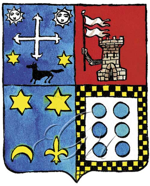 Liñaxe que leva como armas: primeiro, en campo de azul, unha cruz floreteada de prata, acompañada no xefe de dous soles figurados de ouro en cada cantón, e en punta dun lobo de sable, arrimado de dúas estrelas de ouro; segundo, en campo de goles, unha torre de pedra e, saíndo por detrás dela, un brazo armado da súa cor, que sostén na man unha hasta de prata, da que saen dúas bandeiras do mesmo metal; terceiro, en campo de azul, dúas estrelas de ouro nos cantóns do xefe, e un minguante e unha flor de lis do mesmo metal nos da punta; cuarto, en campo de prata, seis roeis de azul, postos en dous paos; bordo axadrezado de ouro e sable en dúas ordes.
