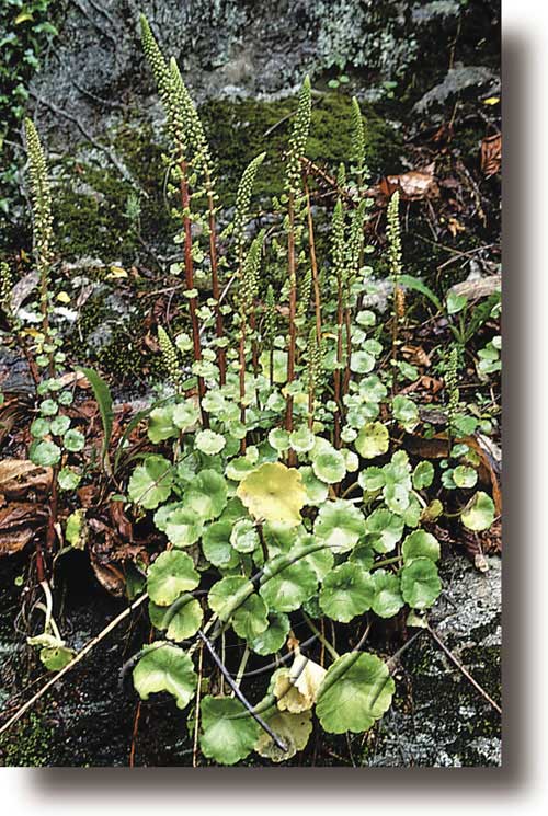 Herbácea perenne, de ata 50 cm de altura, con follas basais arredondadas, carnosas e pecioladas, semellantes a un funil e de ata 7 cm de diámetro. As flores están dispostas de xeito pendurante en longos acios e teñen a corola tubular pentámera de ata 10 mm de lonxitude e de cor branca verdosa. Distribuída polo sur e polo oeste de Europa, en Galicia é común entre pedras, valados e tellados. A planta presenta trimetilamina e taninos, ademais de mucilaxes, polo que ten propiedades cicatrizantes e diuréticas; así, as follas esmagadas aplícanse en feridas e a epiderme enteira da folla aplícase como apósito.