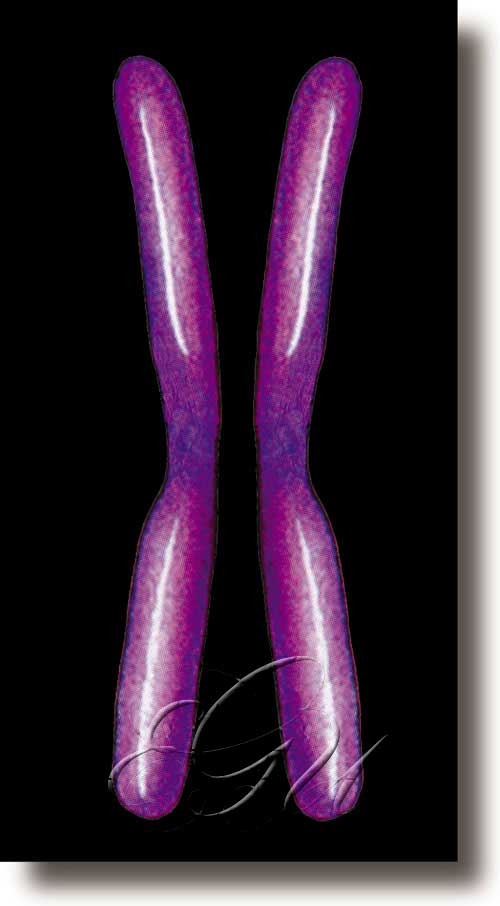 Cada un dos orgánulos celulares que conteñen os materiais portadores da herdanza biolóxica. En sentido estricto, só se emprega este nome no caso dos organismos, tanto unicelulares coma pluricelulares, formados por células que teñen núcleo diferenciado (células eucariotas). Nas bacterias, o material hereditario está constituído por un filamento pechado, circular, de ADN. Este filamento, chamado por algúns autores xenóforo por ter a mesma función ca os cromosomas eucarióticos -ó igual ca o filamento de ADN ou ARN que constitúe o material xenético dos virus-, desígnase moi a miúdo co nome de cromosoma. Os cromosomas nos organismos superiores son visibles durante os procesos de división celular (mitose e meiose) en forma de corpos máis ou menos cilíndricos e de aspecto compacto. Pola súa facilidade para tinxirse, a substancia que forma os cromosomas recibe o nome de cromatina; nesta, o ADN portador da información xenética asóciase con histonas, outros tipos de proteínas, fragmentos de ARN e, en menor proporción, lípidos, catións bivalentes e enzimas. A estrutura dos cromosomas varía en función das fases do ciclo celular. No núcleo interfásico, aínda non en división, preséntanse en forma de longos filamentos invisibles ao microscopio óptico, agás certas partes que aparecen como masas de cromatina dispersas polo núcleo e que se fan visibles na división celular. Aparecen ao principio desta como un filamento con nós ou nobelos que teñen o aspecto de granulacións e reciben o nome de cromómeros. Nesta fase, os cromosomas teñen a aparencia dun rosario. Despois, o longo filamento cromosómico enrólase ata adquirir a forma dun bastón compacto, que se vai separando lonxitudinalmente en dúas partes, as cromátidas, que formarán os dous cromosomas fillos independentes. Ao falar de cromosomas, sen outra especificación, faise referencia aos que aparecen nestas fases e especialmente aos da metafase da mitose. O seu aspecto é de corpúsculos cilíndricos cun estreitamento, chamado centrómero, que os divide en dous brazos e que dirixe os movementos dos cromosomas durante a división celular. Segundo a posición do centrómero, os cromosomas clasifícanse en: metacéntricos, se se sitúa no centro e divide o cromosoma en dous brazos iguais; submetacéntricos, se está algo desprazado do centro e divide o cromosoma en dous brazos desiguais; acrocéntricos, se está moi preto dun extremo; e telocéntricos, se está nun extremo. Á parte do centrómero, o cromosoma pode presentar estreitamentos secundarios preto dos extremos dos brazos que delimitan unha proporción co nome de satélite. No extremo de cada brazo, o cromosoma ten un fragmento chamado telómero que controla que se manteña o tamaño en cada ciclo replicativo. Á fin do proceso de división, os cromosomas desenvólvense, ata que deixan de ser visibles ao volver o núcleo á interfase. Submicroscopicamente, o cromosoma está formado por un filamento continuo de cromatina constituída por unha única molécula de ADN de gran lonxitude que contén unha serie de múltiples xenes. Mediante técnicas xenéticas, pódense elaborar mapas dos cromosomas nos que se marca a posición dos xenes. Hai diferentes tipos de mapas nos que as distancias entre xenes teñen distinto significado, pero a ordenación dos xenes é sempre a mesma nunha especie determinada. A elaboración do mapa xenético humano é un labor de grande envergadura abordado polo Proxecto Xenoma Humano, que pretende, ademais, identificar non só a posición senón tamén a función de cada xene. As bacterias adoitan ter un só cromosoma, mais nos organismos superiores a cantidade de material xenético é moi alta e o ADN repártese entre diversos cromosomas. Agás nos casos en que hai anomalías, o número de cromosomas é o mesmo en todos os individuos dunha especie, e este número mantense mediante os mecanismos de división celular observados na mitose e na meiose. Na primeira, cada cromosoma divídese lonxitudinalmente en dous cromosomas fillos -idénticos entre eles e idénticos a aquel do que proceden- que pasan a unha célula filla diferente; deste xeito, as células fillas reciben un conxunto de cromosomas idénticos aos da nai. Na segunda hai un mecanismo que mantén a constancia do número cromosómico entre os individuos das especies con reprodución sexual e que presentan, como consecuencia, dúas fases en relación ao número de cromosomas. Os gametos teñen un número de cromosomas que é a metade dos que hai no cigoto. Non obstante , nos gametos hai un representante de cada un dos tipos de cromosomas existentes na especie, é dicir, unha dotación cromosómica completa. Denomínase haploide á fase que presenta un número de cromosomas dunha dotación completa (n) e diploide á que ten dúas dotacións completas (2n). Nas células diploides, os dous cromosomas idénticos reciben o nome de homólogos. Moitos organismos superiores presentan heterocromosomas ou cromosomas sexuais que se diferencian dos outros no feito de que nun dos sexos os dous compoñentes non son idénticos. A súa combinación determina o sexo dos individuos. Denomínase homogamético o sexo cos dous heterocromosomas idénticos e heterogamético o que os ten diferentes ou só ten un. Hai algúns tipos especiais de cromosomas, como os cromosomas xigantes ou politécnicos, que se dan especialmente nas células das glándulas salivais das larvas dalgúns dípteros, sobre todo das do xénero Drosophila. A súa orixe explícase polo feito de que estas células deixaron de dividirse -mentres que os seus cromosomas seguen a facelo- nun proceso especial; vanse duplicando dentro do núcleo e os novos filamentos quedan xuntos formando un feixe. Outro tipo son os cromosomas plumosos, presentes nos oocitos da maioría dos vertebrados e dalgúns invertebrados durante o diploteno da meiose. Son cromosomas desenvoltos, totalmente ou en gran parte, que van transcribindo a s