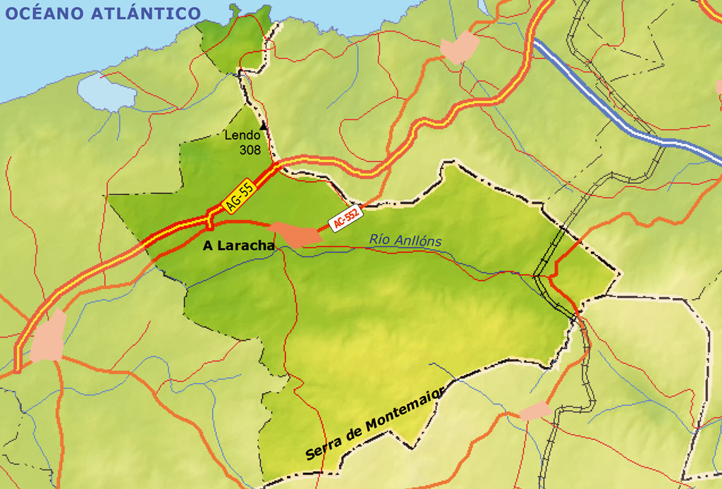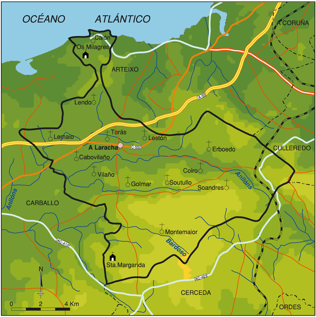 Concello da comarca de Bergantiños, situado ao O da Comunidade Autónoma de Galicia e da provincia da Coruña. Limita ao N co concello de Arteixo (A Coruña) e o Océano Atlántico, ao L cos concellos de Culleredo (A Coruña) e Cerceda (Ordes), ao S co de Cerceda e ao O co concello de Carballo (Bergantiños). Está situado a 43° 14’ latitude N e 8° 34’ lonxitude O. A Laracha localízase a 22 km ao SO da cidade da Coruña e a 62 km da capital galega, Santiago de Compostela. Abrangue unha superficie de 125,8 km 2 cunha poboación de 10.871 h (2007) distribuídos nas parroquias de Cabovilaño, Caión, Coiro, Erboedo, Golmar, Lemaio, Lendo, Lestón, Montemaior, Soandres, Soutullo, Torás e Vilaño. A capital do concello é A Laracha, na parroquia de Torás. Está adscrito á arquidiocese de Santiago e ao partido xudicial de Carballo.