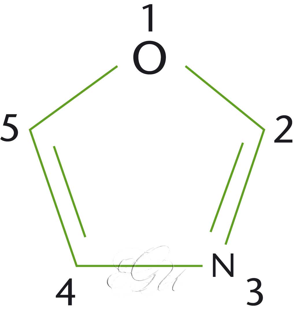 Composto heterocíclico que consiste nun anel carbonado de cinco membros que contén á vez un átomo de osíxeno e un de nitróxeno. OBS: A grafía <x> representa o son [ks].