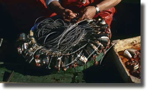 Aparello que consiste esencialmente nunha corda longa que pode acadar varios quilómetros, da que colgan outras cordas máis finas, denominadas ramais, cada unha delas provista dun anzol no extremo libre. Sitúanse a diversas profundidades segundo a especie obxecto de pesca e deste xeito poden calarse no fondo (como na pesca da pescada) ou ben na superficie (atún).