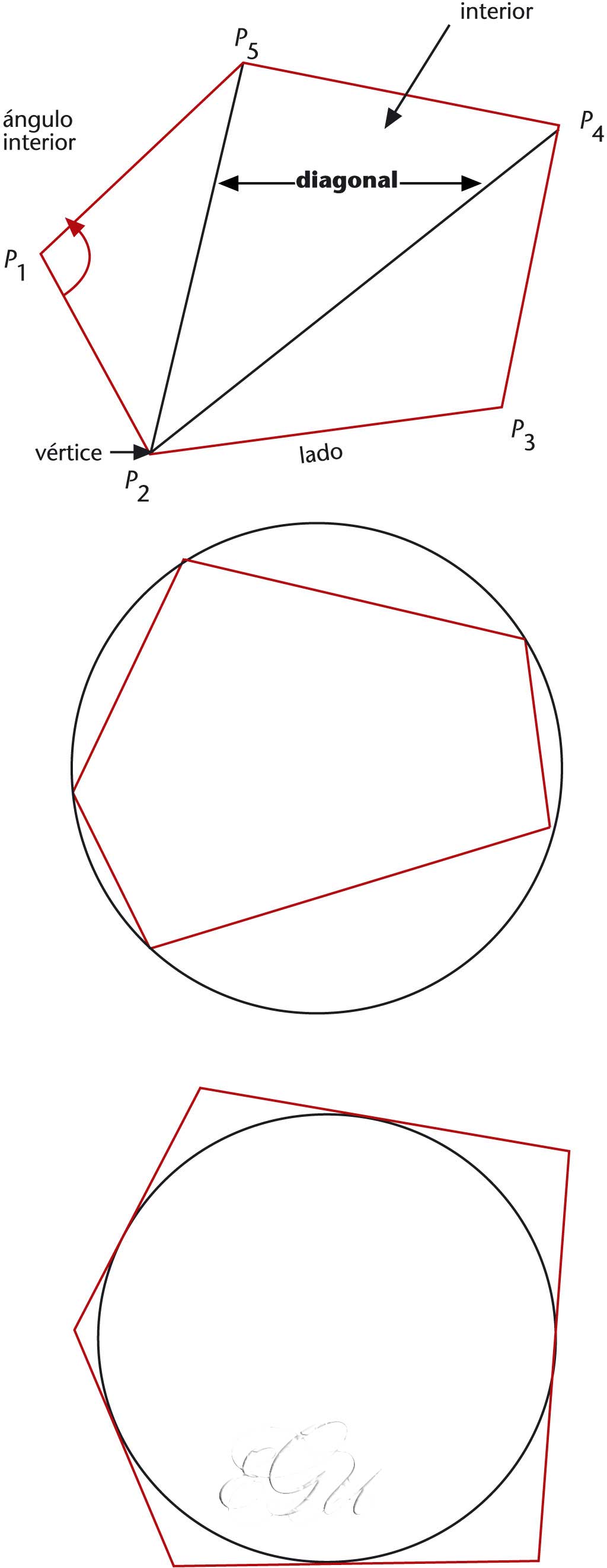 Figura plana e pechada formada polos segmentos rectos P 1 P 2 , P 2 P 3 ,..., P n-1 P n e P n P 1 , que se chaman lados do polígono, sendo os puntos P 1 , P 2 ,..., P n , con n ≥ 3, os vértices do polígono. Unha diagonal do polígono é o segmento recto que une dous vértices non correlativos. Un polígono é equiangular se ten iguais os seus ángulos interiores, é equilátero se ten iguais os seus lados, e é regular se ten os ángulos e os lados iguais. Un polígono está circunscrito nunha circunferencia se os seus lados son tanxentes á circunferencia, e está inscrito nunha circunferencia se os seus vértices pertencen á circunferencia. Segundo o seu número de lados, algúns polígonos reciben as seguintes denominacións especiais: triángulo (3 lados), cuadrilátero, paralelogramo, rombo, romboide, rectángulo, cadrado, trapecio (4), pentágono (5), hexágono (6), heptágono (7), octógono (8), enneágono (9), decágono (10), hendecágono (11), dodecágono (12), pentadecágono (15), icoságono (20) e n-ágono (n).