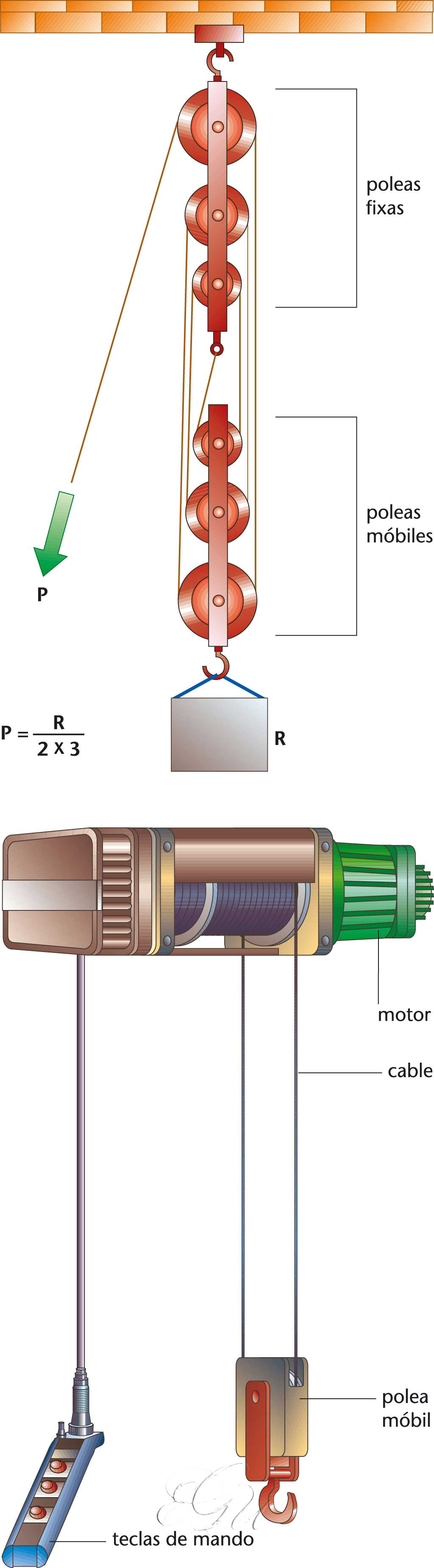 Sistema formado por dous grupos dunha ou máis poleas cada un, un fixo e outro móbil, que permite, ao multiplicar a forza aplicada a un cable, a unha cadea ou a unha corda, manual ou mecanicamente por accionamento eléctrico (mediante un motor) ou pneumático (mediante pistóns ou ben un motor), elevar cargas con menos esforzo -proporcionalmente ao número de poleas do grupo móbil- do que cumpriría.
