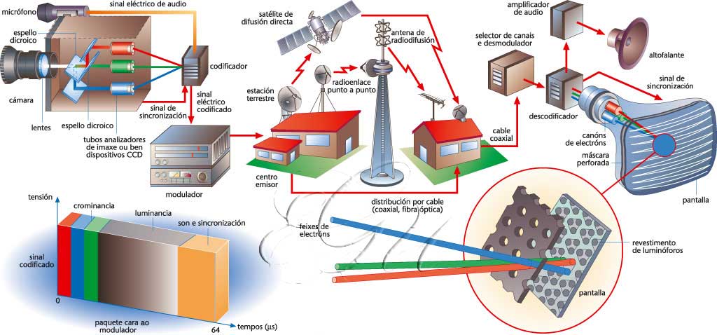 Transmisión a distancia de imaxes en movemento e de sons por medio de ondas electromagnéticas ou ben de cable. O alemán P. G. Nipkow patentou un sistema electromecánico de TV en 1884, en que a cámara consistía nun disco rotatorio con buratos formando unha espiral que permitían iluminar sucesivamente pequenos elementos do obxeto. O sinal luminoso recollíase nun dispositivo feito de selenio en que se producía unha corrente variable coa intensidade da luz reflectida. Un receptor en sincronismo cun disco semellante e sincronizado co da cámara invertía o proceso e mostraba a imaxe. A velocidade de rotación do disco determinaba, neste caso, o número de tramas de imaxe transmitidas por segundo. O primeiro sistema de televisión apareceu en Inglaterra (1926) da man do escocés J. L. Baird, e consistía esencialmente no sistema de Nipkow, máis un amplificador, un transmisor e un receptor electrónicos. A BBC empregou o sistema electromecánico de Baird para transmitir a partir de 1926 imaxes de TV de 30 liñas e 10 imaxes por segundo. O sistema mellorouse ata alcanzar 240 liñas e 25 imaxes por segundo antes de ser substituído polos sistemas totalmente electrónicos. Os receptores mecánicos de TV, vendidos en Inglaterra e EE UU desapareceron a partir de 1932 ao aparecer os sistemas de TV completamente electrónicos. Estes sistemas baseábanse no tubo de raios catódicos (CRT) inventado polo alemán K. F Braun baseándose nos traballos do inglés William Crookes. Os primeiros en aplicar os CRTs á televisión foron os rusos Boris Rosing e Vladimir Zworyking. Este último estableceu a base da TV moderna. Despois aparecerían o Orthicon e o Vidicon que tamén se empregaron como tubos de cámara. En Europa, as cámara de TV xeran 625 liñas para representar a imaxe a unha velocidade de 25 imaxes por segundo. O sinal dunha liña representa a luminosidade da imaxe desa liña. Para mellorar a calidade da imaxe e diminuír o pestanexo, unha imaxe envíase en dous cadros consecutivos. Os cadros impares conteñen as liñas impares e os pares as liñas pares. Este tipo de imaxe denominábase entrelazada. En EE UU e outros países o sinal de TV ten 525 liñas e xera 30 imaxes por segundo. O número de cadros por segundo (60 no caso europeo) denomínase tamén frecuencia vertical. O diferente valor desta entre EE UU e Europa débese á diferente frecuencia da rede de distrubución eléctrica, dado que o sinal da rede empregábase na xeración da frecuencia vertical do receptor de TV. O sinal que se obtén polo mosaico da cámara de TV mestúrase cos sinais de sincronización de liña e cadro que se requiren para reproducir correctamente a imaxe. Este sinal modula en modo BLV (banda lateral vestixial) a portadora de vídeo do canal de TV correspondente. Ao resultado engádeselle o sinal de son mediante o uso da modulación FM, e o que dá como resultado é un sinal complexo de aproximadamente 7 MHz de ancho de banda. Para a transmisión do sinal pódese empregar a banda de VHF (de 45 MHz a 450 MHz) ou a banda de UHF (de 450 MHz a 862 MHz). As canles de VHF teñen 7 MHz de ancho de banda e as de VHF 8 MHz. As cadeas de televisión comezaron a emitir a cor a principios da década de 1950, e os sistemas máis empregados foron o NTSC orixinado en EE UU, o SECAM de Francia e o PAL de Alemaña. Os sistemas dixitais de TV comezaron na década de 1990, que tamén se denominaron de alta resolución. Teñen a vantaxe de que poden ser transmitidos empregando o ancho de banda das canles analóxicas existentes ou por sistemas de telecomunicacións puramente dixitais, como os sistemas baseados en fibra óptica. Os sinais da TV de alta resolución precisarían velocidades de transmisión tan altas como 200 Mbits/s, imposibles de transmitir empregando as canles de 7 e 8 MHz existentes; por iso, estes sistemas comprimen as imaxes antes de transmitilas, mediante o método MPEG. Os sinais de TV transmítense tanto por antenas repetidoras conectadas á emisora por radioenlaces como por satélites ou sistemas de cable. Neste caso os satélites, son xeostacionarios, situados sobre o ecuador a unha altura aproximada de 36.000 Km. Desde a superficie da Terra aparecen estacionarios, xa que xiran exactamente á velocidade de rotación da Terra.