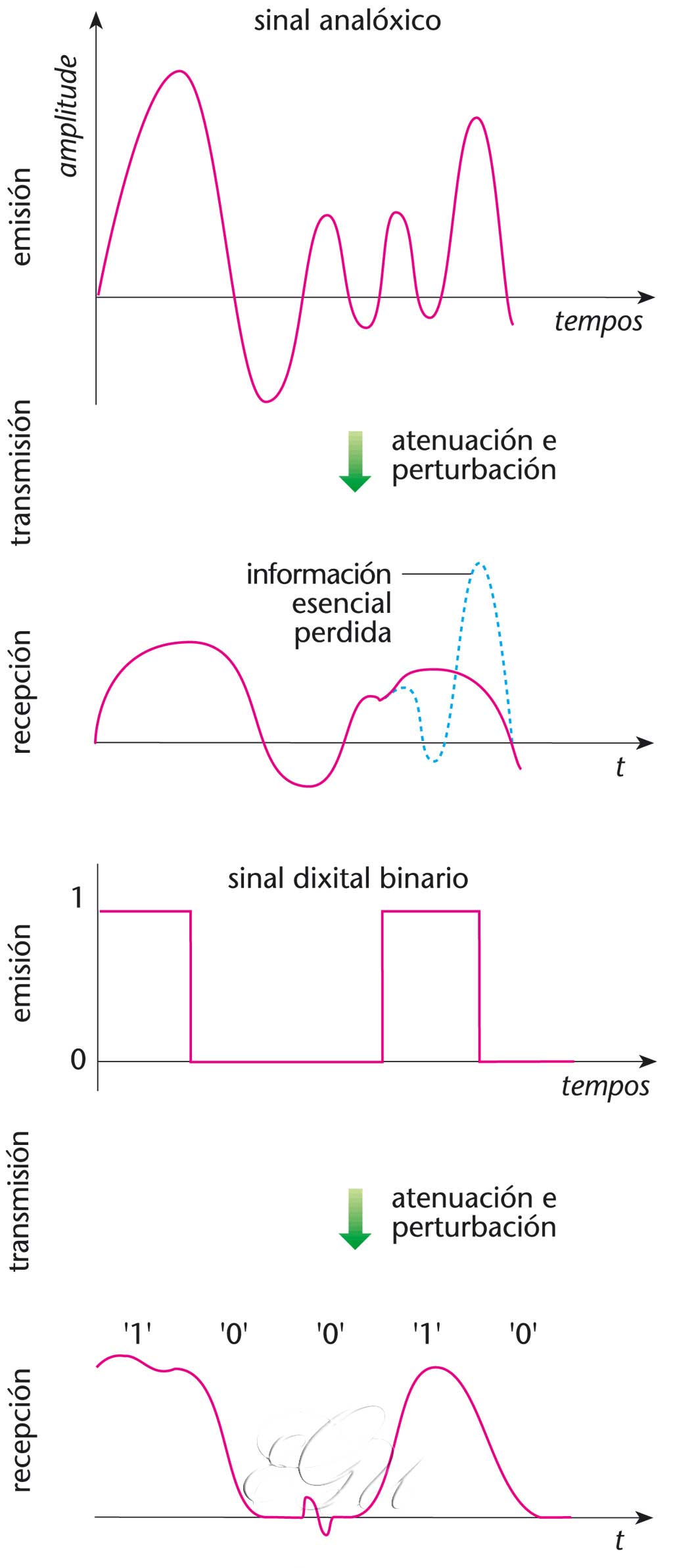 Paso ou transporte de información (sinais) entre dous puntos, por medio da enerxía eléctrica ou electromagnética, e a través dun medio, como é o caso dunha liña de transmisión. Distínguese entre transmisión analóxica, en que os sinais son transmitidos mediante multiplexación por división da frecuencia, e transmisión dixital, en que os sinais de natureza dixital se fan mediante multiplexación por división de tempo. Co fin de mellorar a calidade da transmisión, os sinais analóxicos son traducidos previamente a dixitais.
