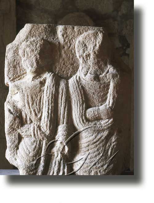 Estela funeraria romana do s III atopada en Vilar de Sarria (Sarria), que contén dous relevos realizados nunha placa granítica rectangular. No anverso aparecen dúas figuras con roupaxes tipo toca, e no reverso represéntase unha escena marítima.
