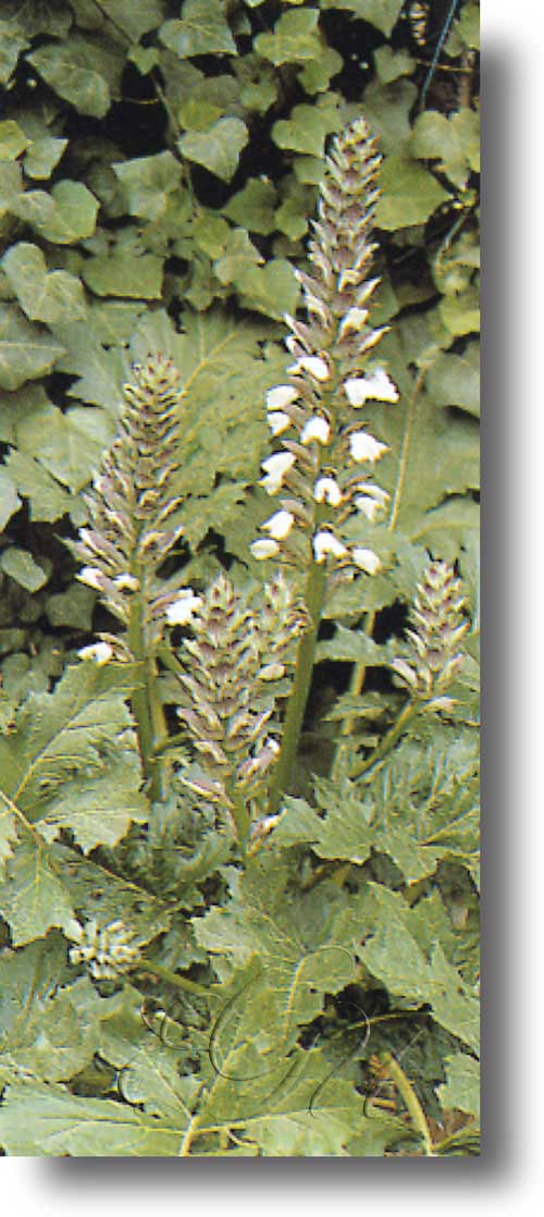Herba perenne, de grandes follas que poden acadar os 60 cm, profundamente lobuladas, de cor verde escura, e flores brancas con veas purpúreas, agrupadas, xuntamente con brácteas espiñentas, nunha longa espiga terminal que pode acadar ata 1 m de altura. En Galicia aparece de forma naturalizada e emprégase contra as queimaduras e como diurético.