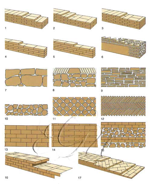 Cada unha destas denominacións correspóndense con distintas combinacións dos tipos principais. Cando os elementos construtivos son máis pequenos, como na obra cocida, a ligadura ten moita importancia e aparecen diversas solucións para acadar un bo ligado. Se o grosor da parede corresponde como mínimo á lonxitude dunha peza, o aparello pode ser inglés, cunha ringleira de pezas postas ao longo e outra ao través; polaco, o que presenta en cada ringleira dúas pezas pousadas ao longo da parede e unha ao través, é o máis empregado; e o holandés, o que presenta unha ringleira de pezas atravesadas e outra formada por dúas pezas ao longo e outra atravesada. Se o grosor da parede corresponde ao da peza (tabique), o aparello máis común é a xuntadora (con xuntas horizontais e inclinadas) ou ben a mestura; a construción en xunta seguida non é moi apta para paredes destinadas a soportar descargas de consideración. Cando se constrúen placas (tabiques, soleiras ou bóvedas) con elementos de grosor heteroxéneo sempre se procura que as pezas se crucen xuntamente tanto no grosor como na lonxitude, resultando placas dunha gran resistencia.