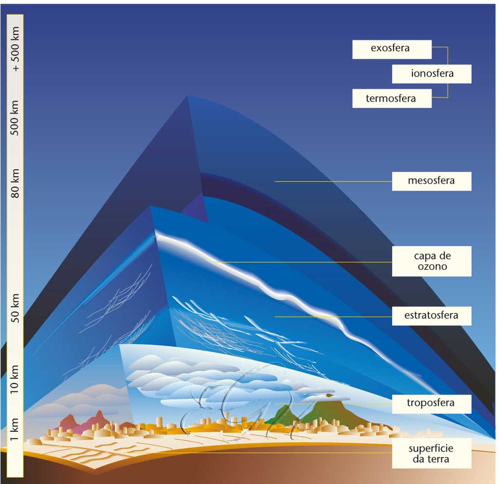 Capa gasosa de forma sensiblemente esferoidal que envolve a Terra. A mestura de gases pola que está formada recibe o nome de aire. Para facer a análise da atmosfera cómpre considerar a estrutura, a orixe, a composición e a participación no balance enerxético do planeta. Resulta útil considerar unha división en cinco rexións de diferente comportamento térmico. A capa inmediata á superficie terrestre é a troposfera; excepto os dous primeiros quilómetros, constátase xeralmente un descenso de 6,5°C por quilómetro ascendido. O descenso de temperatura párase na tropopausa, onde é duns -53°C. A altura da tropopausa varía segundo a latitude, a estación e o tempo, pero, xeralmente, é duns 8-10 km nos polos no inverno e duns 16-18 km no ecuador e trópicos. Nela teñen lugar case todos os fenómenos meteorolóxicos e climáticos, como tamén o ciclo hidrolóxico e o balance O 2 -CO 2 dos seres vivos. Por riba da tropopausa está a estratosfera, zona máis estable, sen practicamente movementos verticais, na que a temperatura medra coa altura, primeiro lentamente, pero máis rapidamente despois, a consecuencia da absorción da calor na ozonosfera. O límite superior, a estratopausa, está a uns 50 km de altura e a temperatura é de 0°C. Por riba atópase a mesosfera, na que a temperatura volve decrecer coa altura ata os 80-90 km (mesopausa), en que se consegue a mínima temperatura da atmosfera, uns -90°C. A capa seguinte é a termosfera, cun límite superior indefinido. Por riba dos 200 km a temperatura crece ata valores máximos que dependen da actividade solar. A exosfera esténdese por riba dos 550 km; nesta zona as moléculas teñen suficiente enerxía cinética para escapar da gravidade terrestre. O límite superior da atmosfera é indefinido, a pesar de que pode considerarse que está situado a uns 5.000 km de altura. Por outra banda, por riba dos 800 km de altura o efecto do campo magnético terrestre é case predominante (magnetosfera). A ionosfera esténdese dende os 60 aos 600 km e contén fortes concentracións de ións orixinados polas radiacións ultravioletas. Dende o punto de vista da composición, a atmosfera divídese na homosfera (ata os 80-100 km de altura), de composición practicamente uniforme, e a heterosfera, de densidade moi baixa (a súa masa é unha millonésima da total atmosférica) e con catro capas caracterizadas polo predominio de N 2 , O, He e N, respectivamente. A composición da atmosfera non varía case coa altura, excepto as cantidades de vapor de auga, dióxido de carbono e ozono. O vapor de auga está practicamente ausente por riba dos 8-18 km; situado na troposfera, é a orixe da formación das nubes e das precipitacións. A cantidade de dióxido de carbono varía a causa da respiración animal, a actividade volcánica e o aumento antrópico. Un aumento da cantidade de CO 2 na atmosfera pode representar un cambio considerable da temperatura global do planeta (efecto invernadoiro). O ozono prodúcese a uns 30-60 km de altura; a causa da circulación atmosférica, o ozono acumúlase nunha capa situada a uns 25 km de altura. A existencia desta ozonosfera é dunha importancia crucial, xa que a molécula de ozono absorbe a radiación ultravioleta solar comprendida entre os 0,2 e 0,3 μm de lonxitude de onda, letal para as formas terrestres da vida. A existencia da atmosfera permite o equilibrio entre a radiación solar recibida e a radiación terrestre emitida, e asegura a estabilidade térmica do planeta. Os movementos, tanto verticais como horizontais, constitúen a circulación xeral atmosférica. A enerxía solar incidente na atmosfera exterior é absorbida, reflectida ou transmitida polas nubes e a atmosfera clara. A enerxía térmica emitida pola Terra (en infravermello) máis o albedo global igualan a enerxía recibida do Sol; deste xeito hai equilibrio. A presión e a densidade da atmosfera decrecen exponencialmente coa altura. A presión atmosférica foi medida por primeira vez por Torricelli en 1643. Adóptase, por convención, como presión atmosférica media sobre o nivel do mar a de 760 mm de altura barométrica. A humidade atmosférica, outro dato de interese meteorolóxico, decrece moi rapidamente coa altura.
